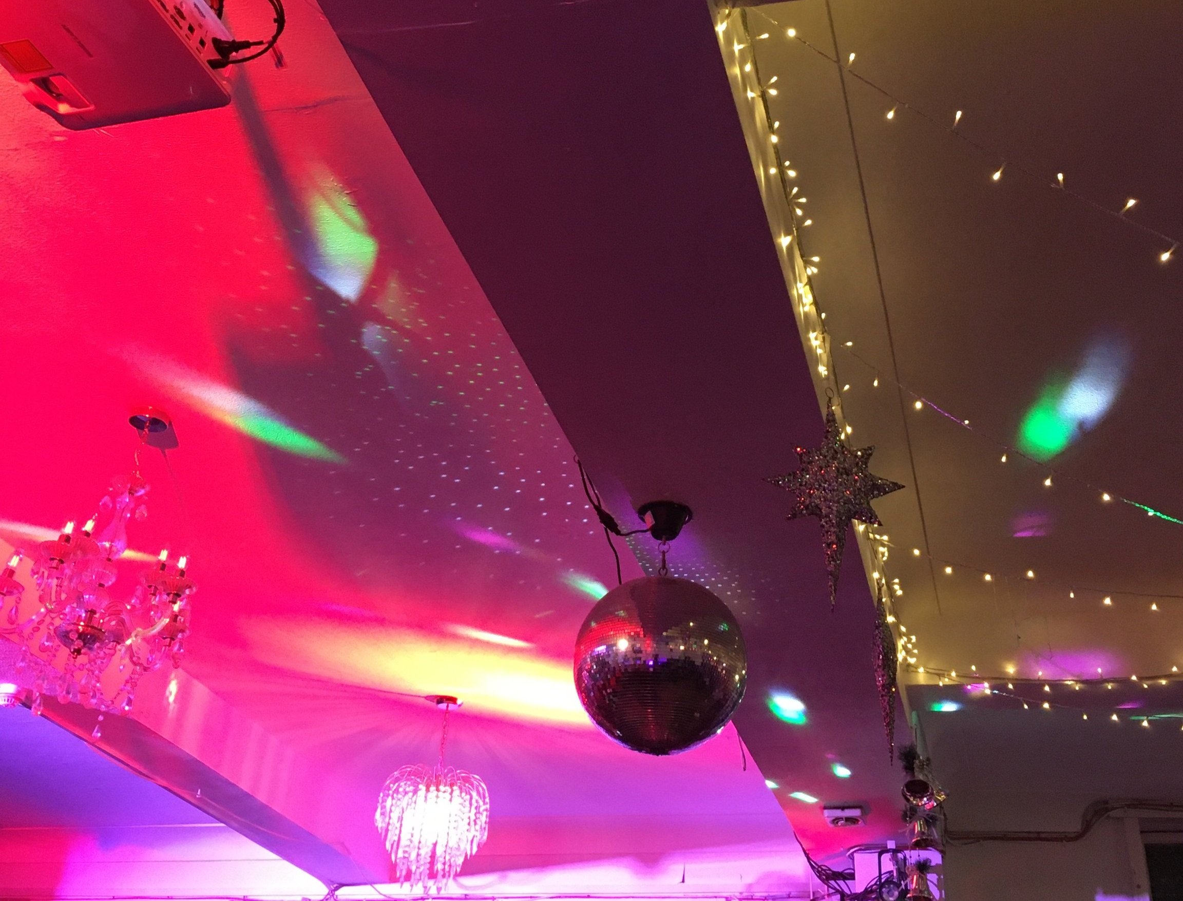 [Image description: from left to right, a chandelier glowing pink; moving lights casting coloured shapes on a ceiling, green, yellow, pink; a glitter ball and hanging sparkly stars; festoons of fairylights. In the background, magnolia paint and pipes.]
